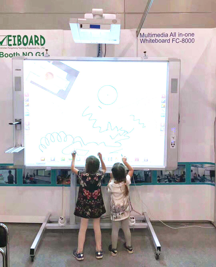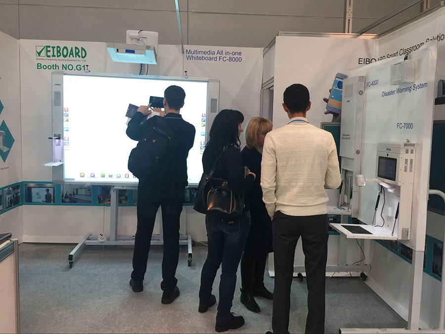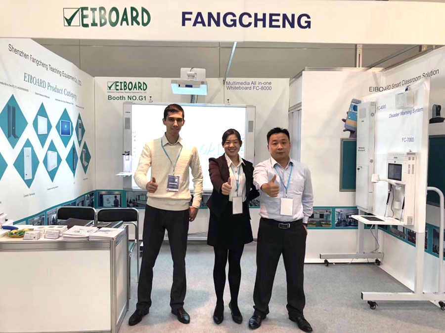 此次展會上,方成教學的一體化電子白板FC-8000非常引人注目,它集成了電子白板,OPS電腦,音箱,展臺和中控系統(tǒng)于一體,配合強大的白板軟件和教學管理軟件,能夠實現網絡控制,視頻錄播,互動傳屏,校園廣播等功能,讓前來體驗的眾多俄羅斯學校老師和學生都大開眼界,稱贊不已。